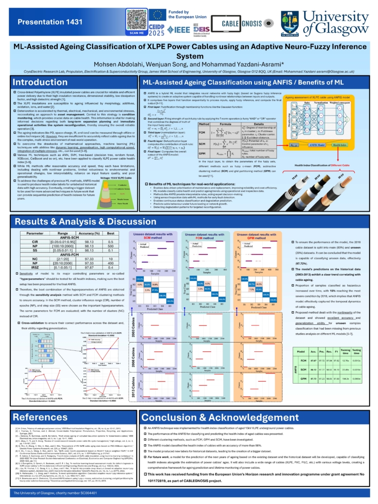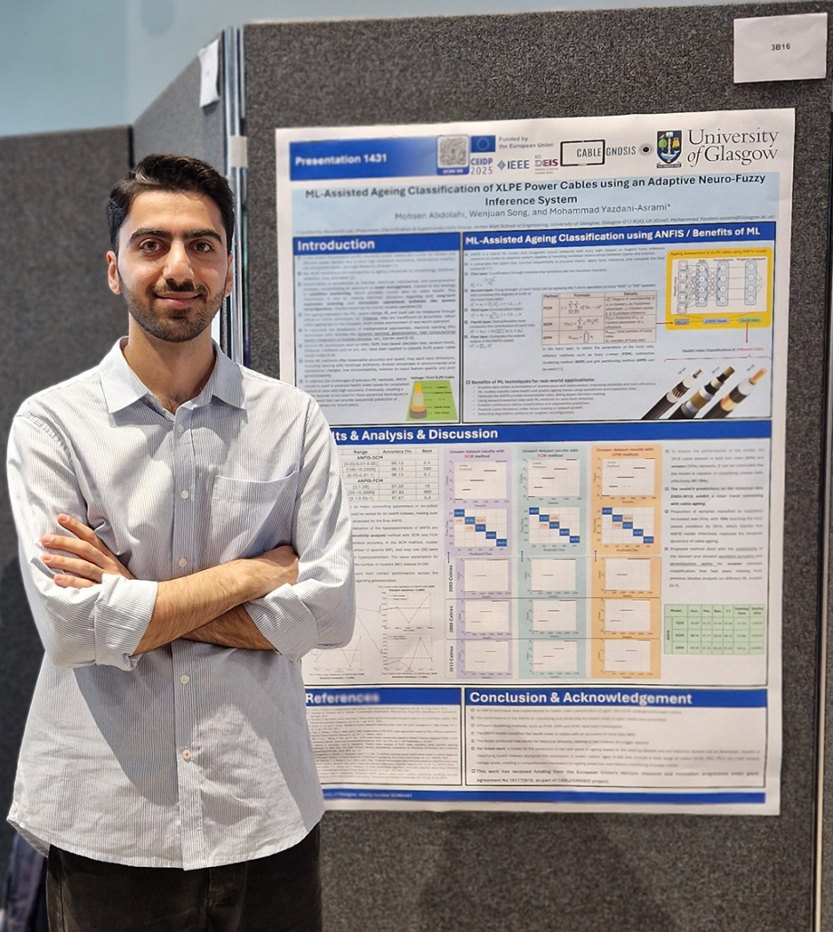 As part of the project’s dissemination activities, Mr. Mohsen Abdolahi, PhD student at the “Propulsion, Electrification and Superconductivity” group, Jamse Watt school of engineering, University of Glasgow, United Kingdom, presented the poster “ML-Assisted Ageing Classification of XLPE Power Cables using an Adaptive Neuro-Fuzzy Inference System”, on behalf of Glasgow team including Dr Wenjuan Song, and Dr Mohammad Yazdani-Asrami. The poster focuses on condition monitoring of power cables using inference-based artificial intelligence model for interpretability purposes. The study highlights how experts can benefit the use of fuzzy inference logic along with neural network, and provides insights that support more reliable asset management for power cables, fully aligned with the objectives of the CABLEGNOSIS project.